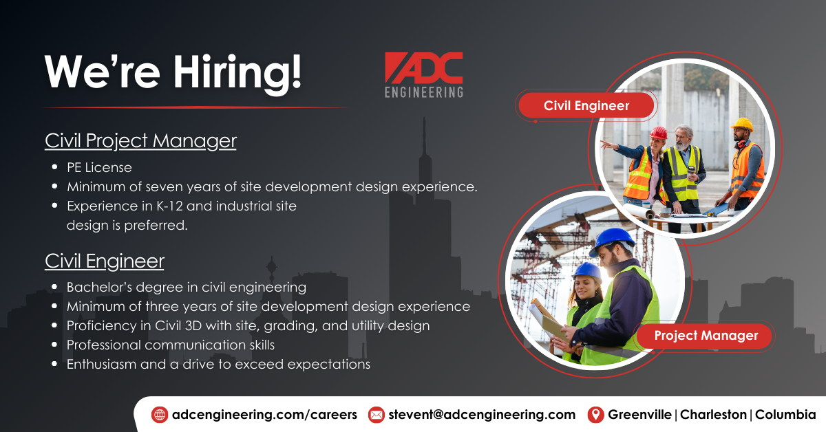 Interested in being a Civil Project Manager or a Civil Engineer? Named one of South Carolina’s “Best Places to Work” in 2018, ADC is home to a highly skilled, caring, and competent team that gives their clients exceptional service.